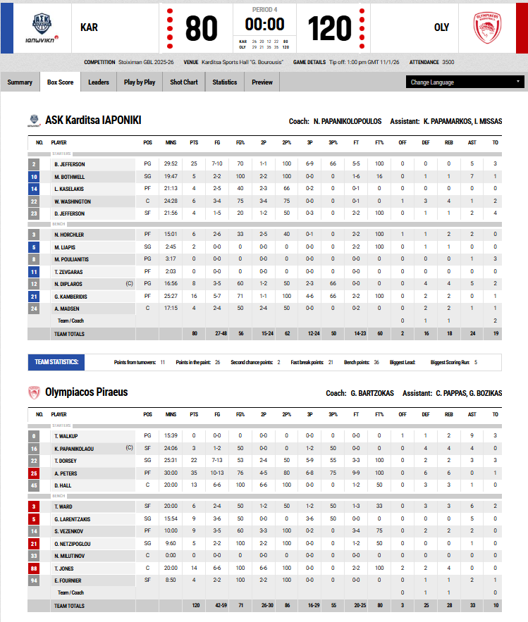Με το αποτέλεσμα αυτό, οι Πειραιώτες παραμένουν αήττητοι στη Stoiximan GBL, ολοκληρώνοντας τον πρώτο γύρο με το απόλυτο και στέλνοντας ξεκάθαρο μήνυμα ενόψει της συνέχειας της σεζόν.