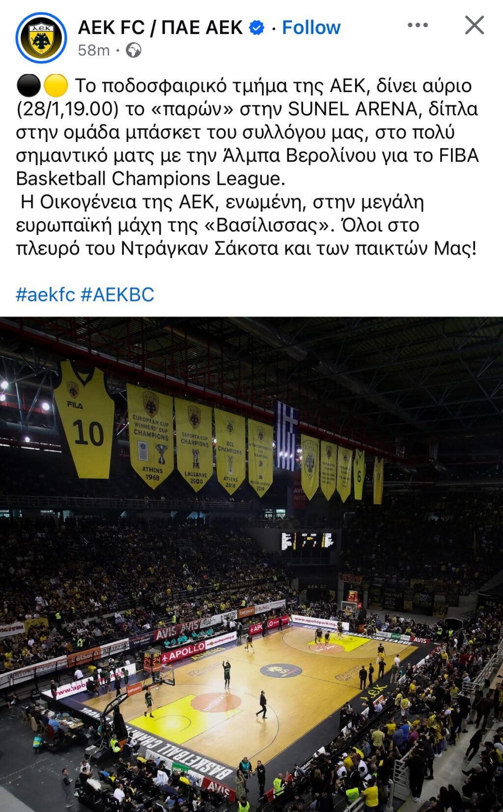 Με ξεκάθαρο μήνυμα ενότητας και στήριξης, το ποδοσφαιρικό τμήμα της ΑΕΚ θα δώσει το «παρών» αύριο (28/1, 19:00) στη SUNEL ARENA, προκειμένου να στηρίξει την ομάδα μπάσκετ του συλλόγου στο κρίσιμο παιχνίδι απέναντι στην Άλμπα Βερολίνου για το FIBA Basketball Champions League.
