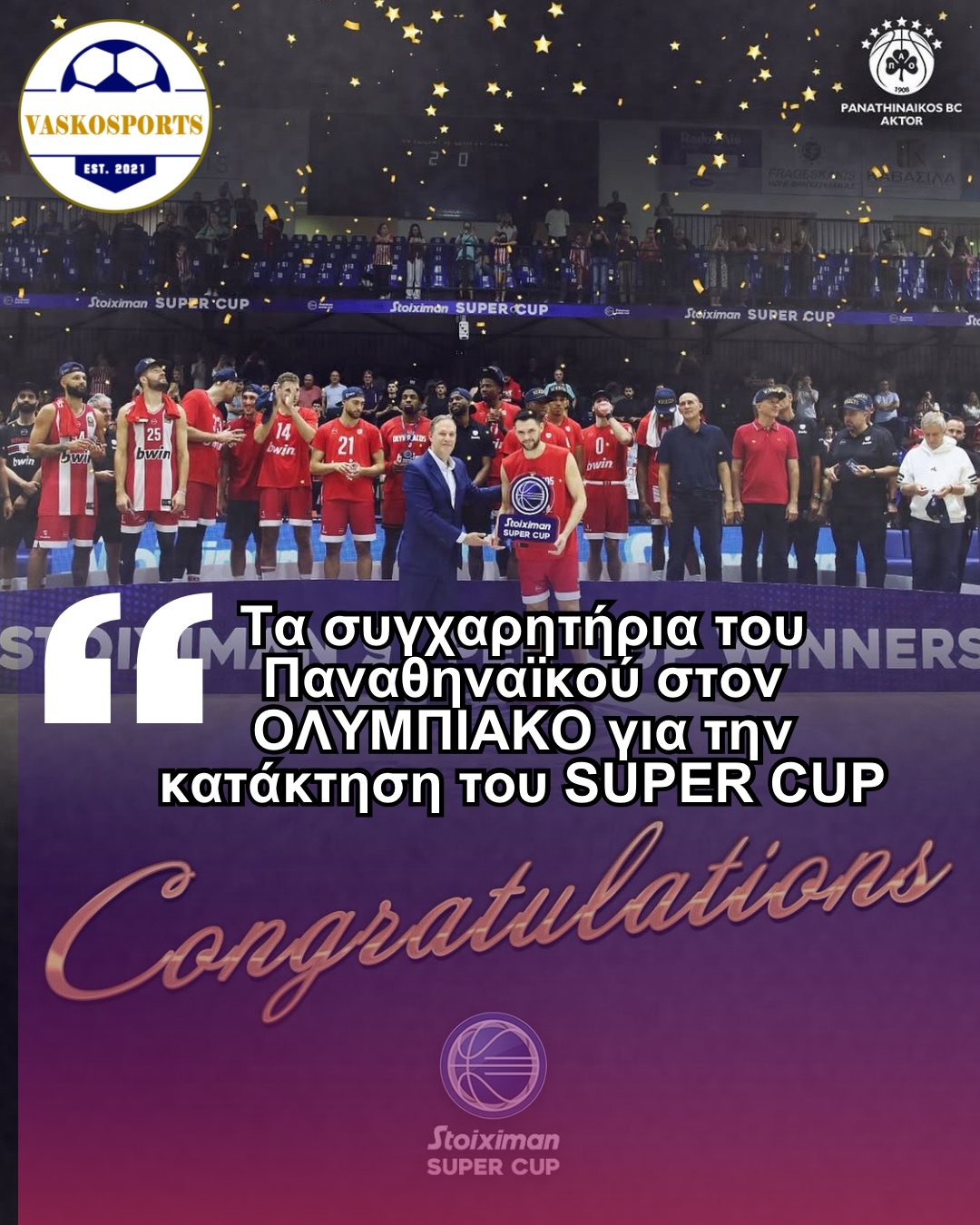 Η ΚΑΕ Παναθηναϊκός AKTOR εξέφρασε δημόσια τα συγχαρητήριά της στον Ολυμπιακό για την κατάκτηση του 2025 Greek Basketball Super Cup. Η ομάδα του Πειραιά επικράτησε με σκορ 92-83 του Προμηθέα Πάτρας στον τελικό του Σαββάτου 27 Σεπτεμβρίου, εξασφαλίζοντας τον τίτλο για τέταρτη συνεχόμενη χρονιά.